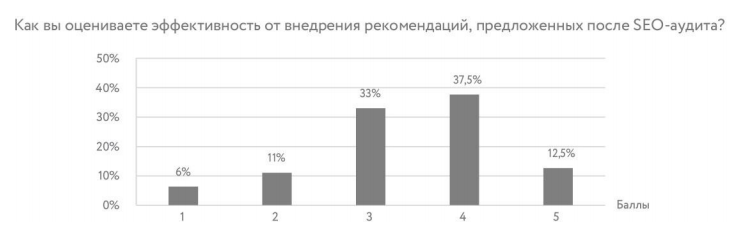 Большинство опрошенных (63%) полностью или частично доверяют проведение SEO-аудитов агентствам. Остальные 83% оценивают эффективность от внедрения рекомендаций, предложенных после SEO-аудита, как средние и выше средних.