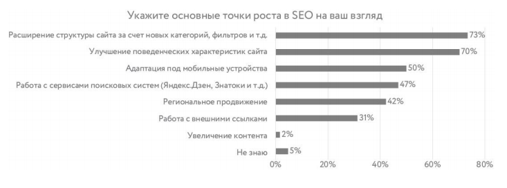 Три точки роста в SEO по мнению опрошенных: расширение структуры сайта (73%), улучшение поведенческих характеристик (70%) и адаптация под мобильные устройства (50%).