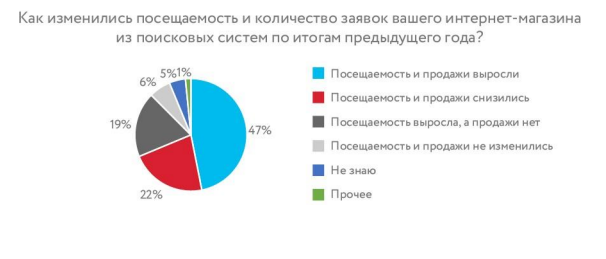 Рост посещаемости интернет-магазинов из поисковых систем отмечают 66% опрошенных. Продажи выросли у 47% участников исследования. Почти у четверти респондентов трафик и продажи из поиска снизились, преимущественно (71%) это небольшие игроки с оборотом менее 800 млн руб. в год.