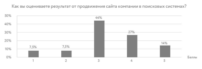 Большинство опрошенных (85%) удовлетворены результатами продвижения в поиске, 44% участников оценивают результаты как удовлетворительные, а 41% характеризуют этот инструмент, как выше среднего. Среди 15% участников, недовольных результатами, только у половины снизились посещаемость и продажи из поисковых систем.