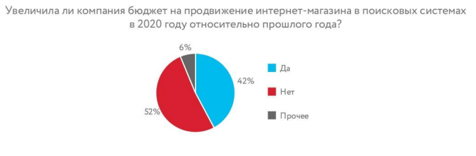 Среди крупных компаний, участвовавших в опросе, две трети (66%) с прошлого года увеличили бюджет на SEO. Среди представителей малого и среднего бизнеса — 42% и 30% соответственно. Крупные компании в основном отмечают рост продаж и посещаемости из поиска, и готовность 66% из них увеличить бюджет выглядит логично. Среди представителей среднего бизнеса 60% заметили рост продаж и посещаемости из поиска, однако 70% ответили, что не увеличат инвестиции в продвижение.