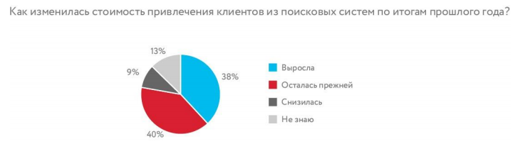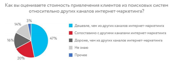 Почти половина участников ответили, что привлечение клиента из поиска обходится дешевле, чем из других каналов маркетинга. У 20% респондентов SEO оказался сопоставим по стоимости с другими каналами маркетинга.