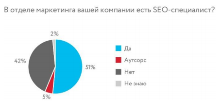 SEO-специалисты в штате есть у 51% опрошенных. Причем онлайн-магазины на базе офлайн-ритейла почти в два раза реже нанимают SEO-специалистов в штат (39%), чем тематические интернет-ритейлеры (69%).