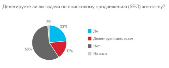 Полностью или частично делегируют продвижение SEO-агентствам 40% участников. Среди них 65% замещают отсутствие штатного SEO-специалиста агентством, а 23% совмещают работу штатного специалиста и агентства.
