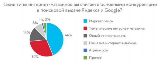 Маркетплейсы — основной конкурент в поиске для 44% опрошенных. Несмотря на то, что онлайн-гипермаркеты так же часто высоко ранжируются в поиске, их опасаются только 14% участников. Оставшиеся 30% респондентов называют соперниками другие интернет-магазины. Ориентируются на конкурентов при построении стратегии продвижения в поисковых системах 66% представителей рынка.