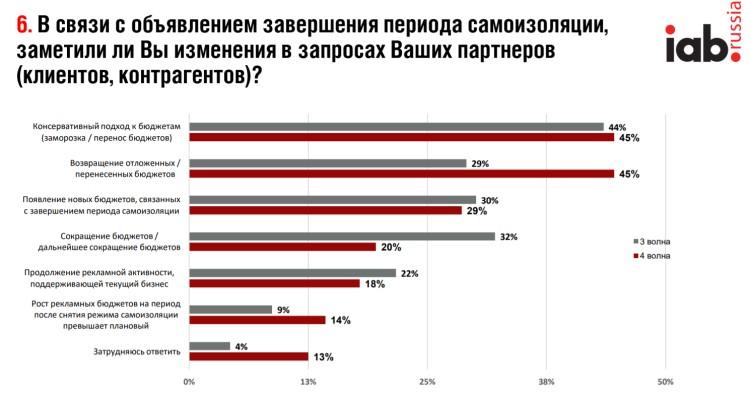 Почти половина (45%) членов IAB Russia сообщили, что в июне наблюдали возвращение бюджетов на интернет-рекламу. Месяцем ранее восстановление расходов на digital отмечали только 29%. Каждый пятый опрошенный сообщил о сокращении бюджетов, пишет «Коммерсантъ» со ссылкой на исследование. Однако в целом бренды придерживаются консервативного подхода — о заморозке либо переносе бюджетов сказали 44% участников опроса в мае и 45% в июне.