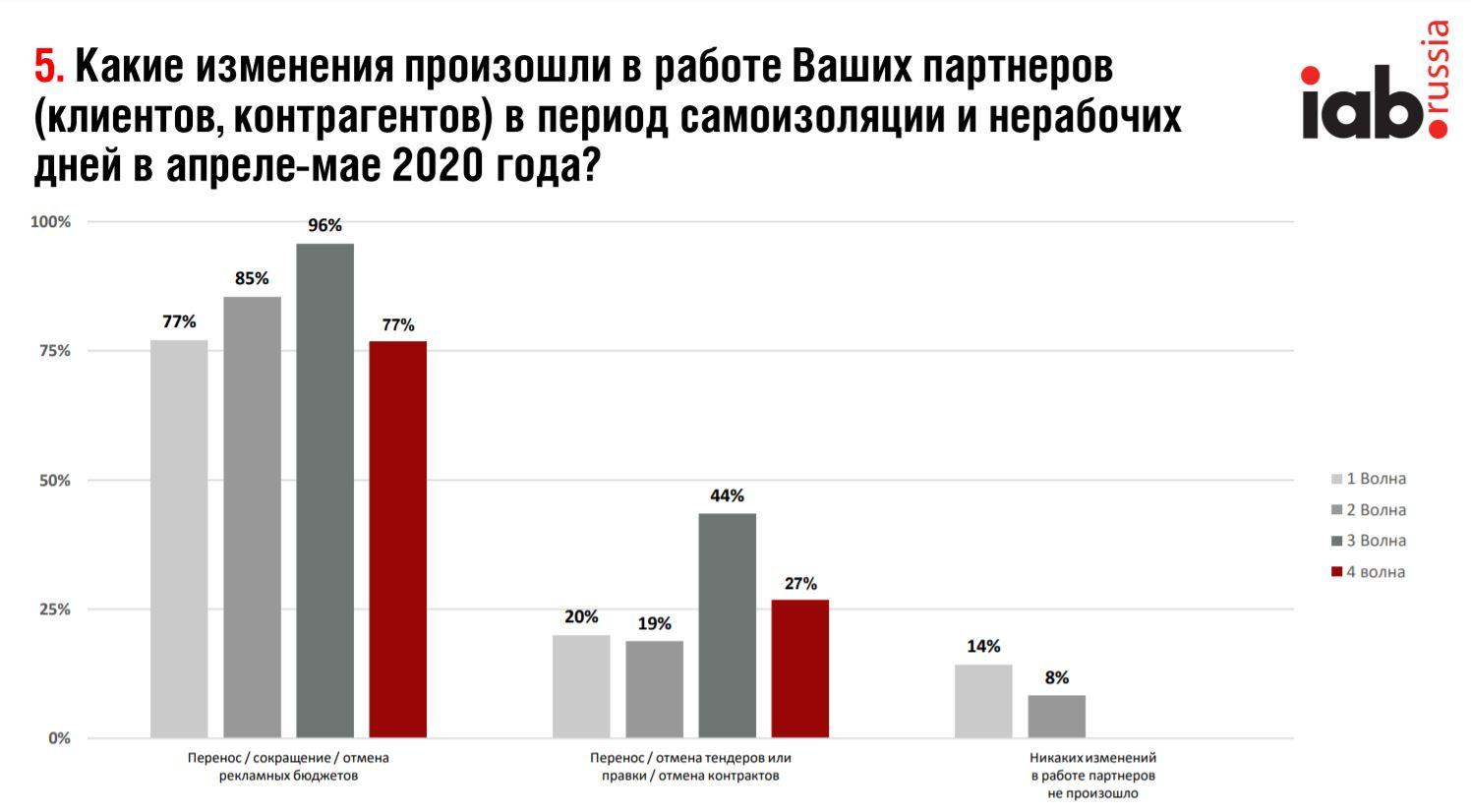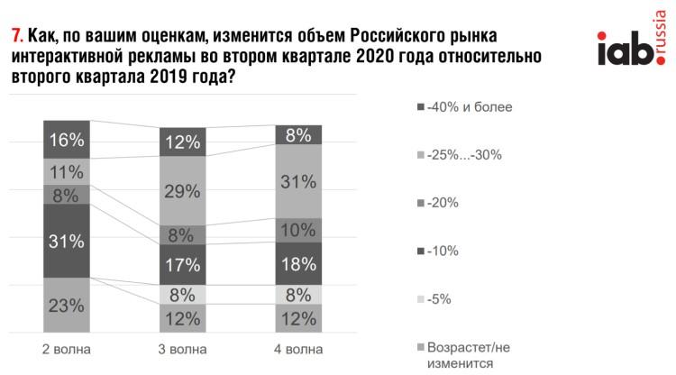 Падения рынка онлайн-рекламы во втором квартале ожидают 85% членов IAB Russia. Каждый третий (31%) полагает, что бюджеты сократятся на 30%. В OMD OM Group придерживаются мнения, что сокращение не превысило 10%, в АДВ оценивают его в 10–20%, в Media Direction Group — в 20–30%, в Dentsu Aegis Network — не менее чем в 20%, в GroupM — в пределах 20–25%.