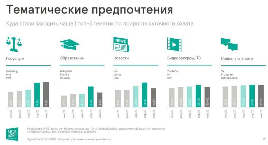 Среди самых посещаемых ресурсов оказались также социальные сети — пользователи чаще всего сидели во «ВКонтакте», «Одноклассниках» и Instagram — и образовательные порталы, в частности «Википедия». Видеоконтент аудитория потребляла в основном на платформах YouTube, ivi и сайте НТВ, а новости — на порталах «РИА Новости», Lenta.ru и РБК.