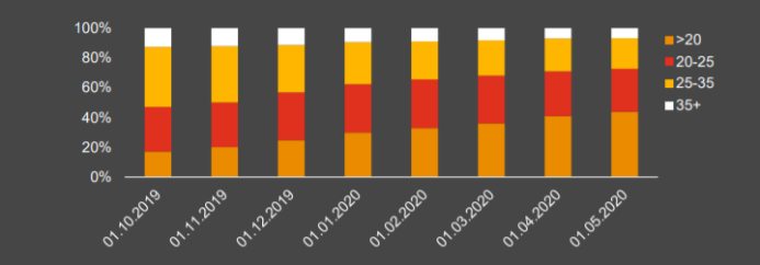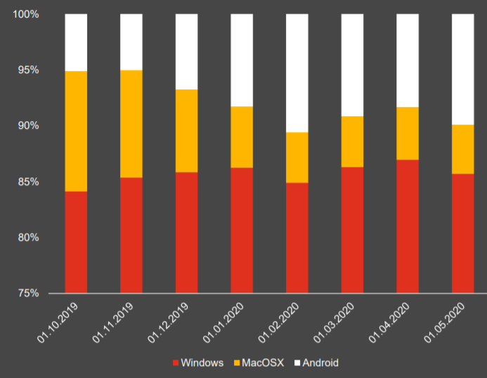 - Большинство игроков использует сервис на ПК с операционной системой Windows, данный сегмент составляет более 85% от всей аудитории. Аудитория, использующая компьютеры под управлением MacOS, занимает приблизительно 5%. А сегмент аудитории, использующей мобильные устройства в период с ноября 2019 по май 2020 г., вырос с 5 до 10%.