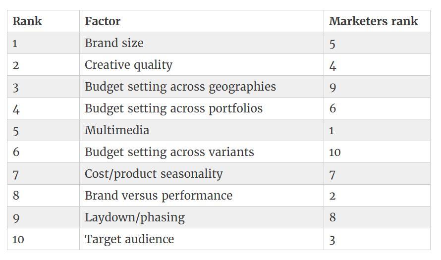 Аналитики сравнили результаты опроса с исследованием, проведенным Kantar в 2014 г. Тогда компания оценила вклад каждого из факторов в увеличение прибыли. Главным драйвером маркетинговой эффективности был назван масштаб бренда, пишет Marketing Week, второе место занял креатив, третье — распределение бюджета по географическим регионам. Медиамикс находился на пятом месте, после распределения инвестиций внутри портфеля брендов.