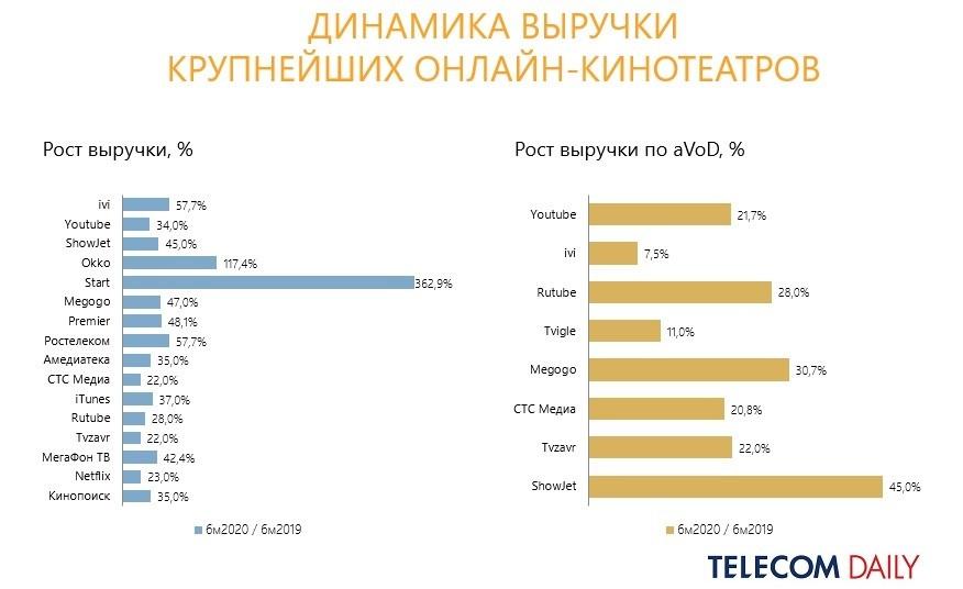 - Максимальную динамику выручки по итогам полугодия (год к году) показал кинотеатр Start (362,9 против 242,2% за 2019 г.). У Okko этот показатель составил 117,4%. Рост ivi и «Ростелекома» — 57,7%, а Premier — 48,1%.