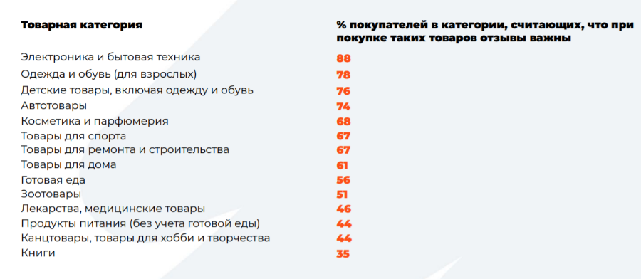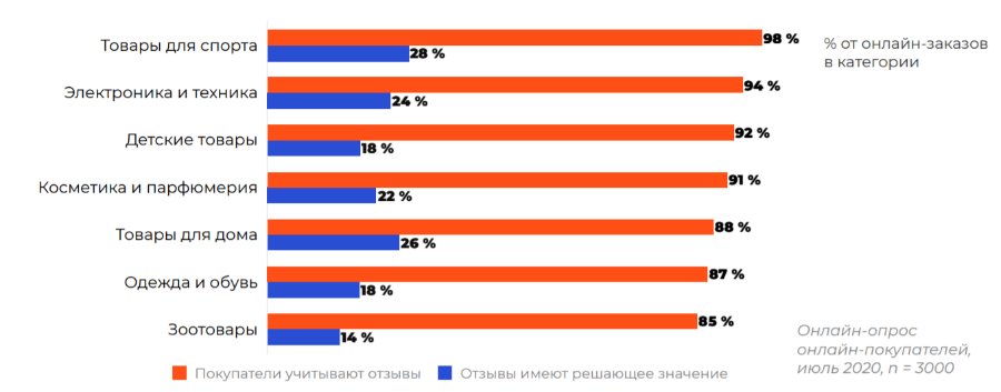 Чаще всего респонденты изучают отзывы при покупке спорттоваров (98% заказов), электроники и бытовой техники (94%), детских товаров (92%), косметики и парфюмерии (91%), товаров для дома (88%).