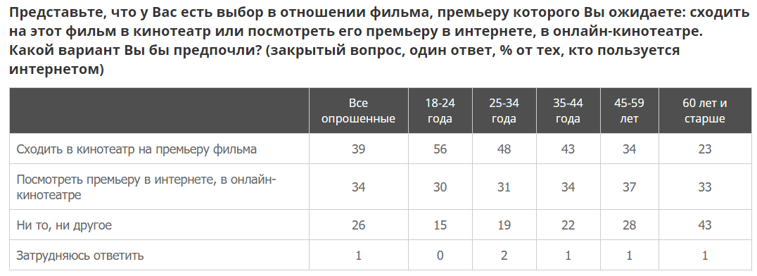 Посмотреть премьеру фильма в интернет-кинотеатре, при прочих равных, предпочтут 34% россиян, опрошенных ВЦИОМ. Еще 39% выбрали посещение кинотеатра, а 29% не стали бы делать ни того ни другого.