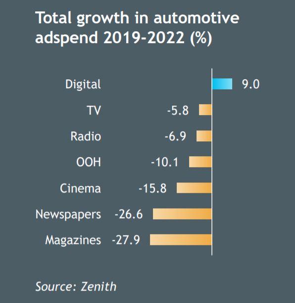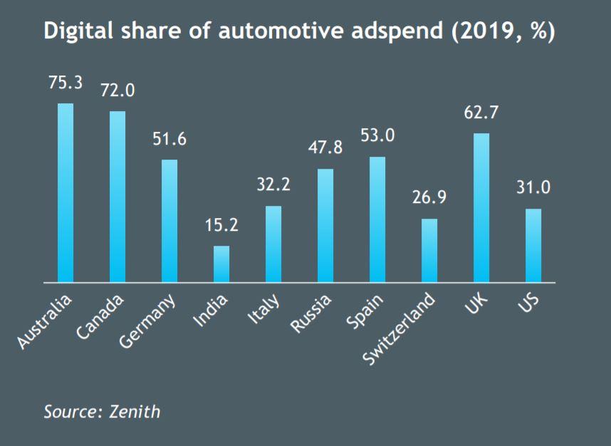 Агентство оценивает долю digital в медиамиксе автомобильных брендов в 42% по итогам 2019 г., что меньше общерыночного показателя в 49%. Зато автокомпании больше тратят на ТВ-рекламу: 32% бюджета против 27% у среднестатистического бренда. Что касается газет, то их доля составляет 11% (общерыночный показатель — 7%), в основном за счет Индии и Германии, где пресса пользуется спросом у образованной, обеспеченной аудитории. Кроме того, автомобильные производители охотно продвигаются в кинотеатрах, где проводит время молодая аудитория, и на радио.