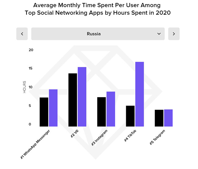 По общему времени, затраченному россиянами на соцсети, лидерами сталиWhatsApp, «ВКонтакте», Instagram. Наибольший совокупный рост в России показалмессенджер Telegram, за ним идут Instagram и TikTok.