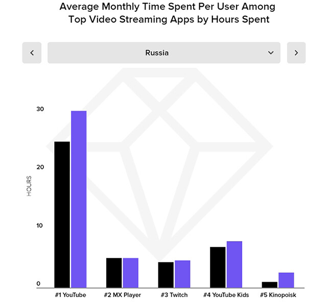 Среди стриминговых сервисов среднее время на пользователя больше всеговыросло у онлайн-кинотеатра «Кинопоиск» — год к году показатель увеличился на175%. Лидером по затраченному времени остается YouTube, где россияне проводилив среднем 30,4 часа в месяц. Годом ранее показатель составлял 25,1 часов.