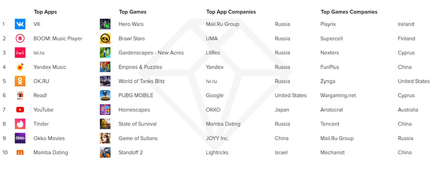 Больше всего денег пользователи оставили в приложениях Mail.ru Group,которому принадлежат занявшие первое и второе место «ВКонтакте» и Boom, а также«Одноклассники», оказавшиеся на пятой строчке. Третье место по затратампользователей досталось онлайн-кинотеатру ivi. Если говорить об общемировойтенденции, то на первое место по затратам вышло приложение для знакомствTinder; в России оно заняло восьмое место.