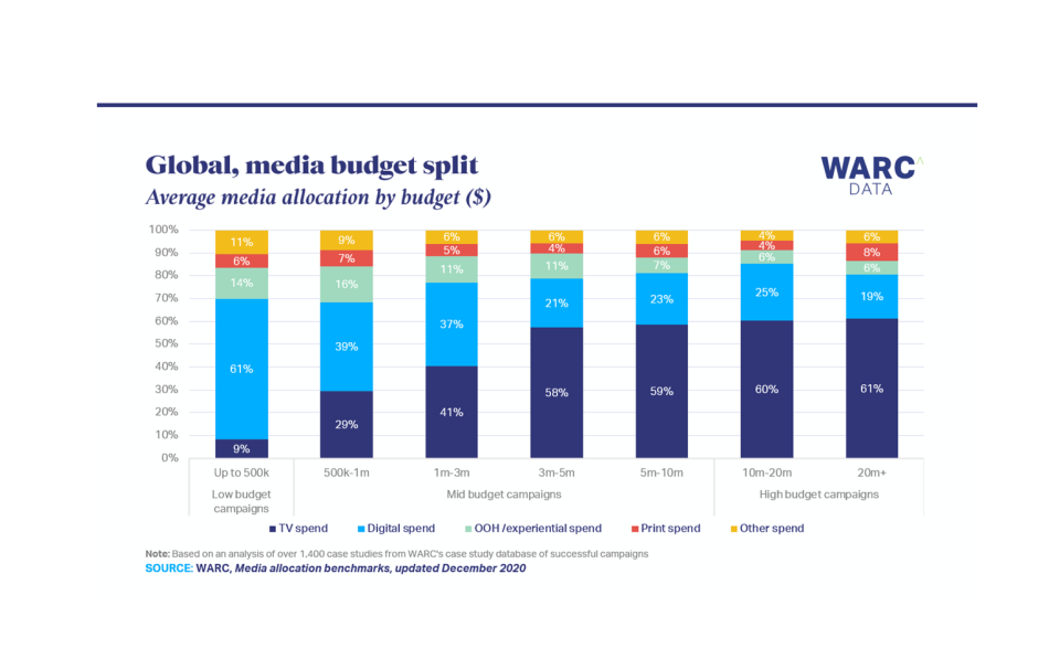Между объемом рекламного бюджета и типом медиаканала существует прямая корреляция, выяснили эксперты WARC, проанализировав данные о 1400 успешных кейсах. Если три пятых (61%) низкобюджетных рекламных кампаний приходится на digital-каналы, то с крупными бюджетами все ровно наоборот. Маркетологи, чьи расходы на кампанию превышают $3 млн, примерно 60% средств распределяют в пользу ТВ