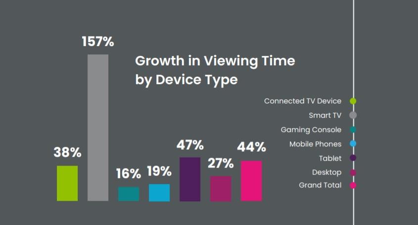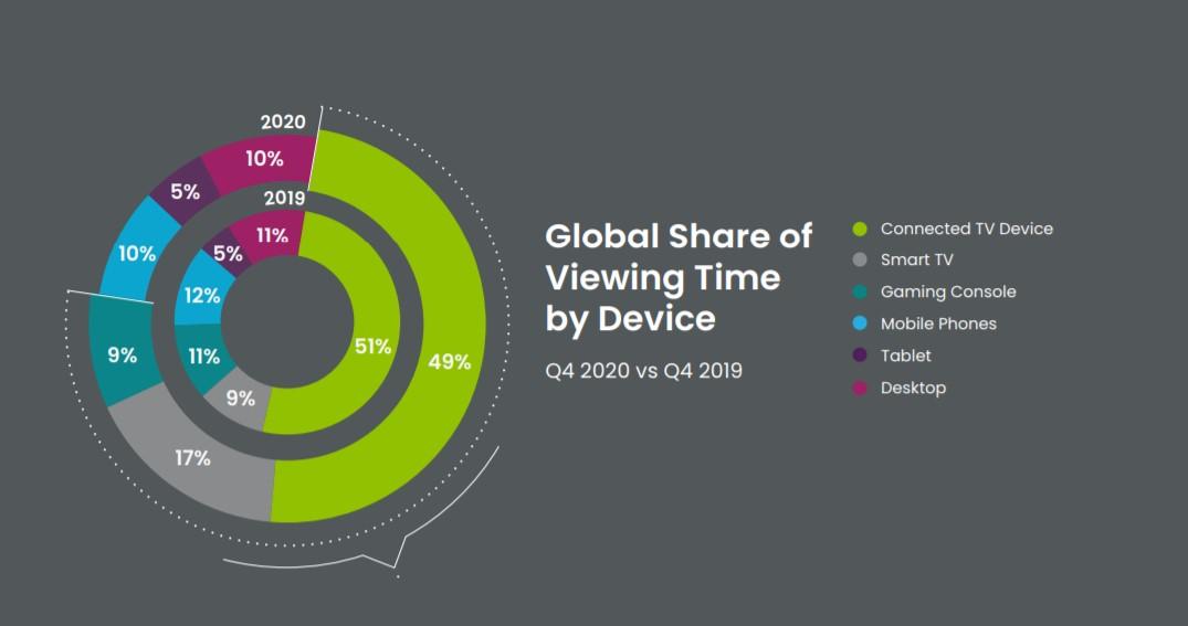 Большая часть времени (49%) пришлась на телевизионные приставки — Roku,Amazon Fire TV, Apple TV, Chromecast и другие. Доля «умных» телевизоров за годвыросла с 9% до 17% — они «отъели пирог» у игровых консолей (9 против 11% годомранее) и гаджетов (10 vs 12%). Популярность больших экранов, естественно,связана с введенными карантинными мерами.