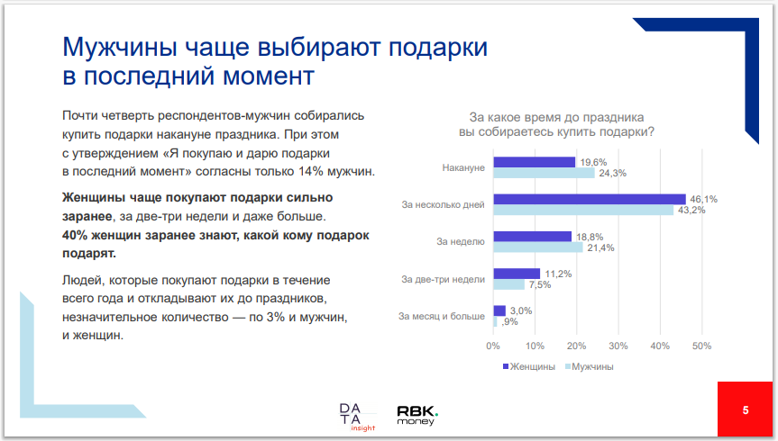 Среди мужчин 43,2% ответили, что они покупают подаркиза несколько дней до праздничной даты; среди женщин таких — 46,1%. Приэтом 40% женщин заранее знают, какой кому сделают подарок. В последний моментпокупают и вручают подарки 14% мужчин.