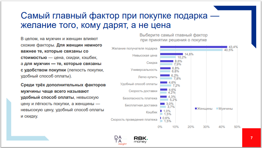 При выборе поздравления для женщин важнее факторы стоимости — цена, скидки, кэшбэк, тогда как мужчин привлекает легкость приобретения