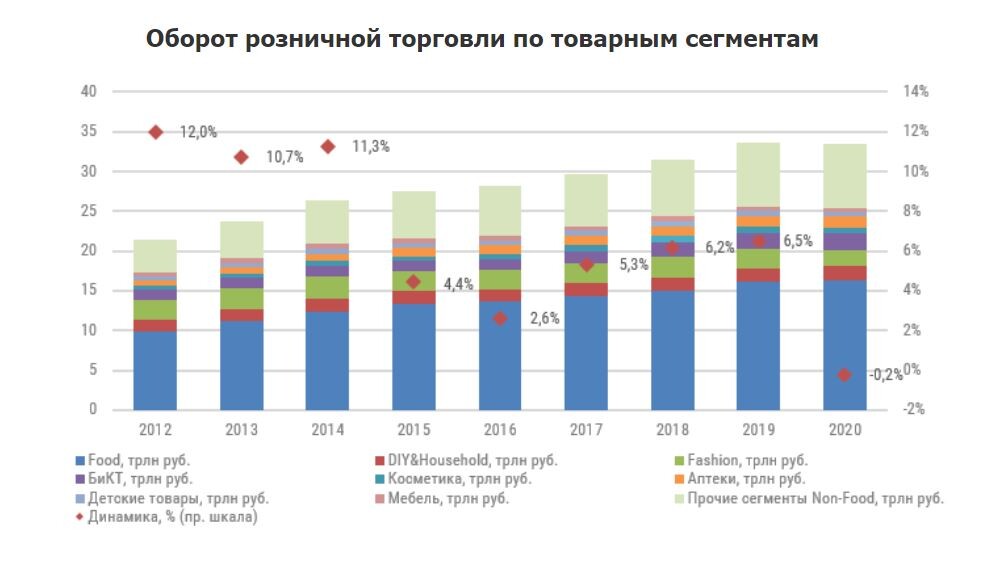 Динамика различных сегментов была разнонаправленной. Если аптеки показалирост на 7%, а бытовая техника, электроника и мобильные устройства — на 12%, тов остальных сегментах наблюдалось сокращение продаж. Так, сегмент Fashionоказался наиболее пострадавшим во II кв. 2020 г., когда население урезалорасходы на одежду и обувь более чем на 50%. По итогам всего года оборотымодного сегмента снизились почти на 17%, подсчитали аналитики.