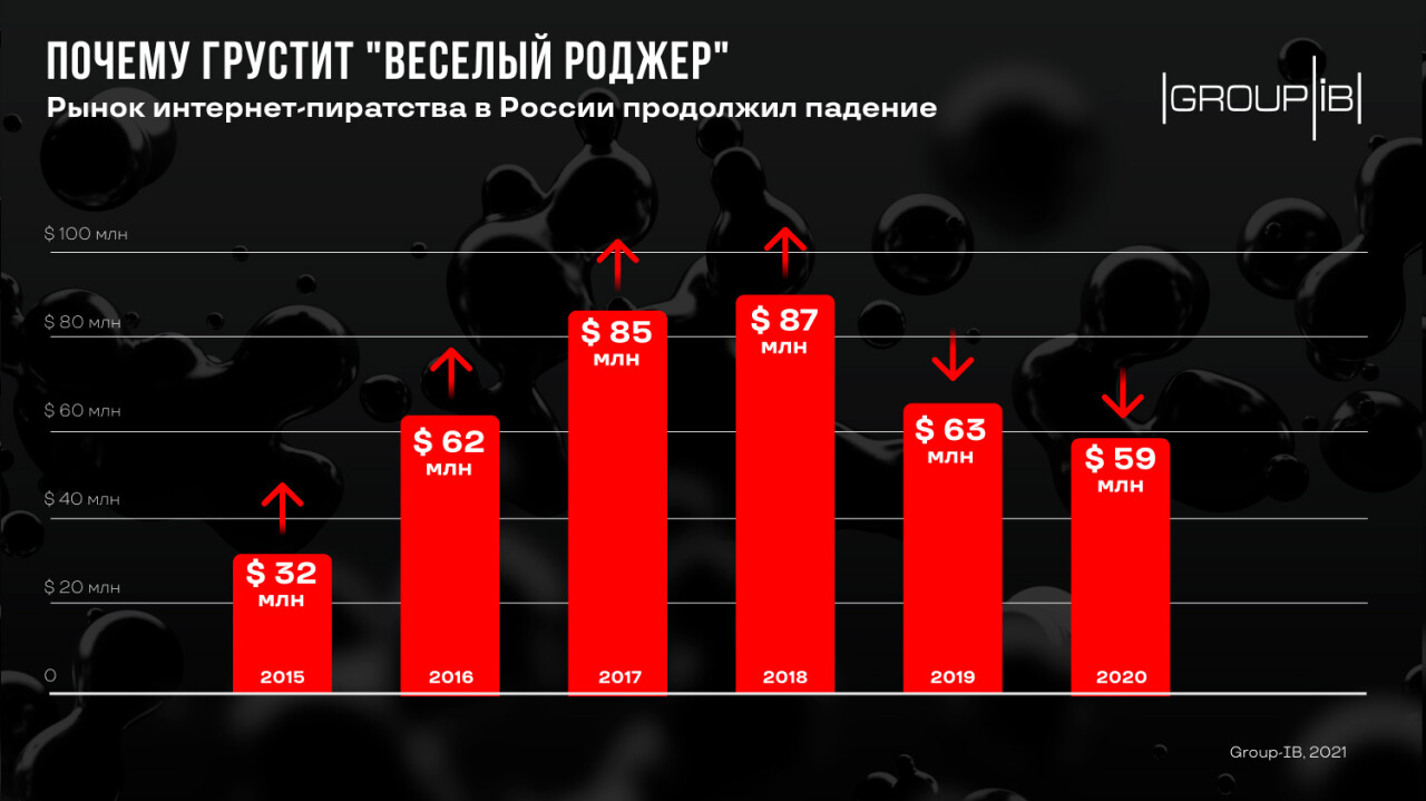 В 2020 г. видеосервисы — как легальные, так и пиратские — существенноувеличили аудиторию, однако наплыв зрителей не помог пиратам увеличить доходы.Теневой рынок видеоконтента по итогам года сократился на 7%, с $63,5 млн до $59млн, подсчитали аналитики Group-IB.
