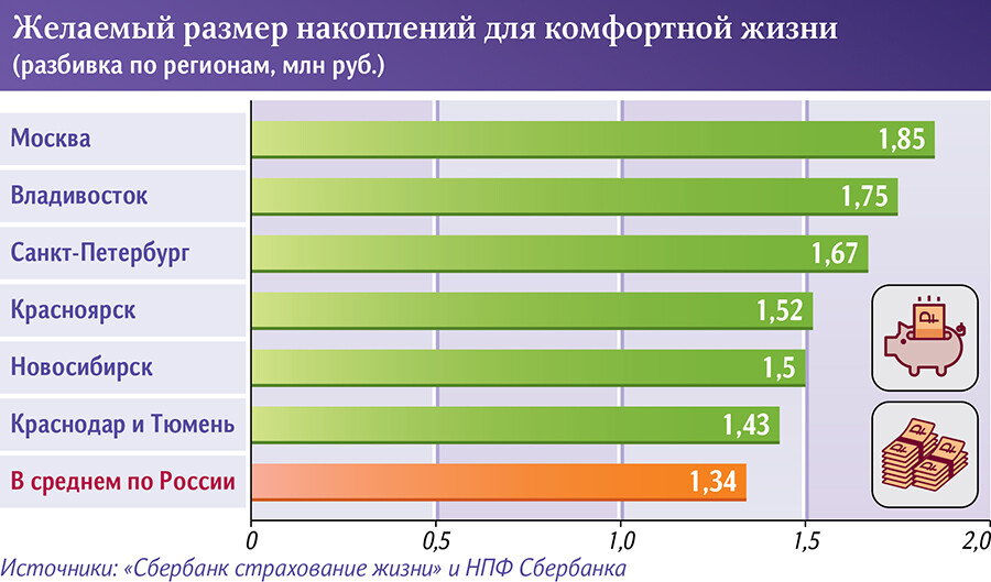 Большинство респондентов сказали, что им нужно около 1,3 млн руб., чтобычувствовать себя уверенно. Самые крупные суммы назвали жители Москвы,Владивостока и Санкт-Петербурга — 1,8 млн, 1,7 млн и 1,6 млн руб.соответственно.