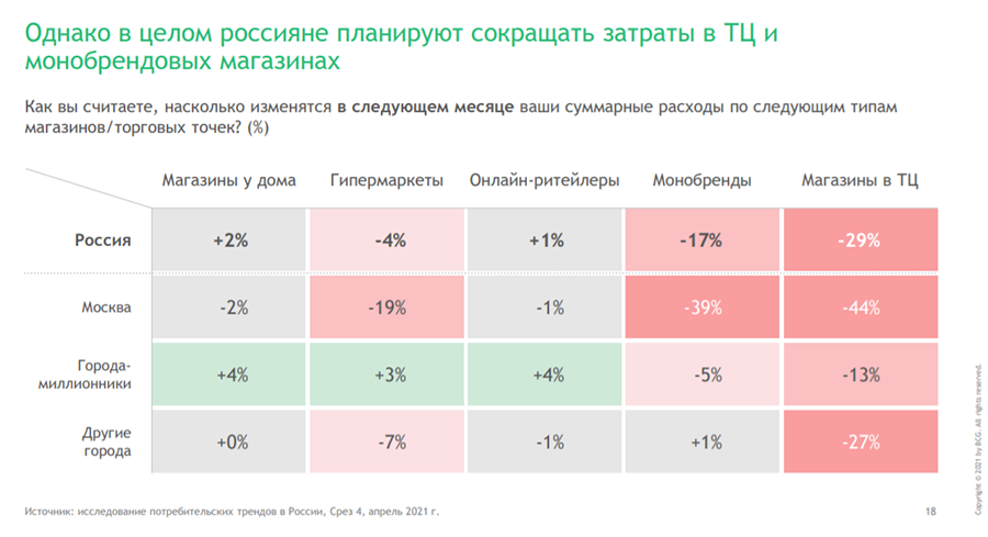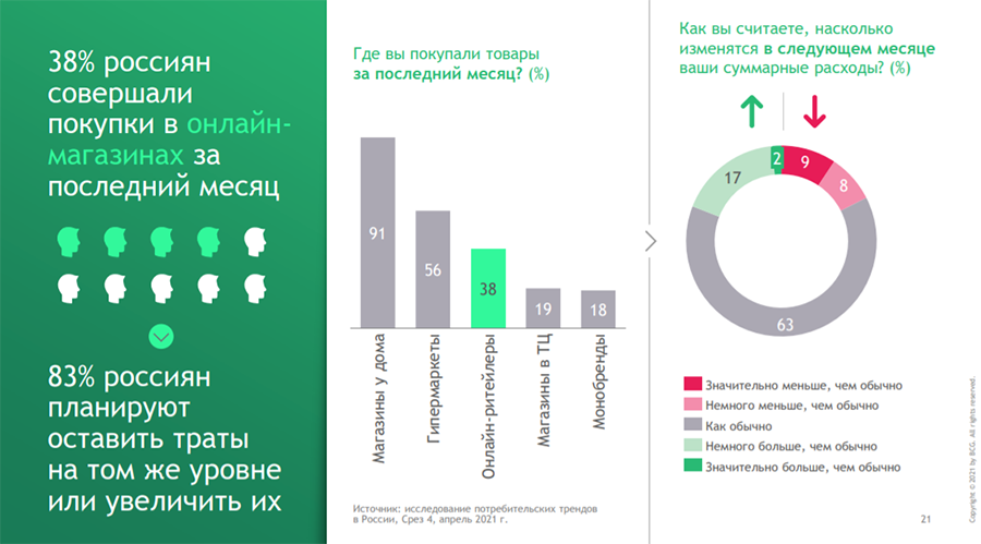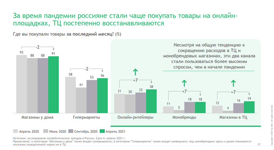 Среди каналов продаж лидируют электронная торговля и магазины у дома.«Потребители привыкли покупать товары онлайн за время пандемии, но после снятияограничений стали чаще посещать магазины рядом с домом, отмечают исследователи.При этом даже спустя год после начала пандемии москвичи все еще сильнообеспокоены по поводу опасности нахождения в людных местах, что ведет кзначительному сокращению спроса на покупки в гипермаркетах в Москве, при этомжители регионов стали беспокоиться об этом меньше», — отмечается висследовании.