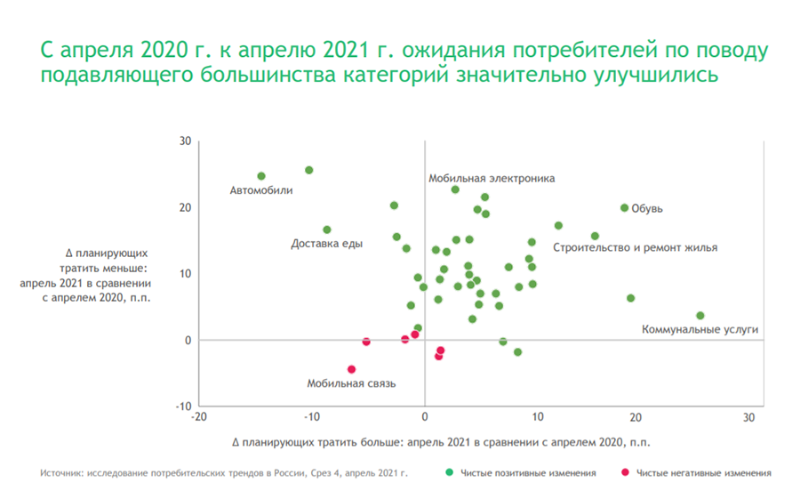 Впрочем, исследователи отмечают постепенное восстановление спроса средипотребителей всех возрастов. В сравнении с апрелем 2020 г. ожиданияпотребителей относительно их расходов в ближайшие полгода значительноулучшились по 44 из 50 категорий товаров и услуг. Вместе с тем чистый ростзатрат прогнозируется лишь в 17 из 50 категорий. Наибольший рост наблюдается вкатегориях, связанных со здоровьем (в первую очередь лекарственные препараты) ипребыванием дома (коммунальные услуги, строительство и ремонт жилья). Высокиетемпы роста прогнозируются для ряда продовольственных товаров (свежие продукты,бакалея и другие основные продукты) и категории обуви.