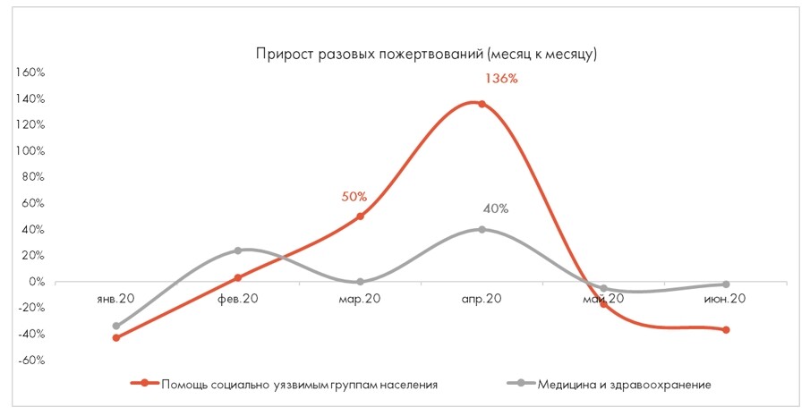Весной, во время первой волны коронавируса, люди стали активнее поддерживатьнекоммерческие организации. В этот период наблюдался существенный рост разовыхпожертвований и менее активный, но уверенный рост регулярных платежей. В первуюочередь это ощутили те НКО, которые работают с социально уязвимыми группами и вмедицине. Сами организации стали проводить акции в поддержку своей работы, алюди — искать возможность поддержать тех, кого пандемия затронула больше всего:врачей, старшее поколение, малообеспеченные семьи и другие уязвимые группы.