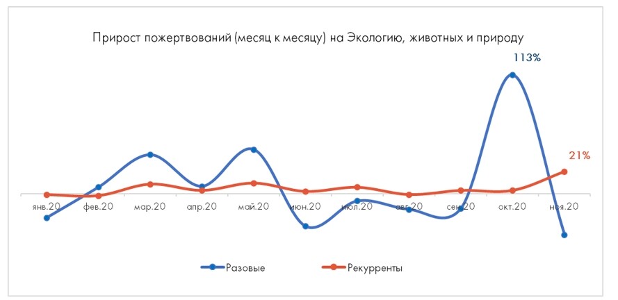 Пожертвования на социально уязвимые группы начали существенно расти в марте.В апреле рост разовых пожертвований достиг пиковых значений — на 136% к уровнюмарта, а подписки с марта по май росли темпами от 4 до 17% месяц к месяцу.Похожая ситуация была в медицине и здравоохранении: в апреле прирост разовыхплатежей к марту составил 40%, а вот подписки увеличивались на 2–10% во времяпервой волны коронавируса. Жертвователи поддерживали не только людей,оказавшихся в трудной жизненной ситуации, и врачей, но также животных иприроду: прирост разовых пожертвований по этому направлению в марте — мае2020 в среднем составлял от 7 до 42%, прирост регулярных платежей — от 3до 10%.
