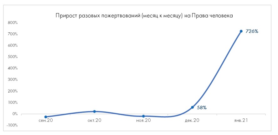 В январе 2021 г. на фоне всероссийских акций протеста эксперты зафиксировалирезкий скачок пожертвований правозащитникам — прирост к декабрю составил200%. При этом разовые пожертвования увеличились почти в восемь раз к тому жемесяцу прошлого года. Февраль продолжил эту тенденцию — прирост разовыхпожертвований снизился лишь на 8% в сравнении с январем, прирост подписоксоставил 44%.