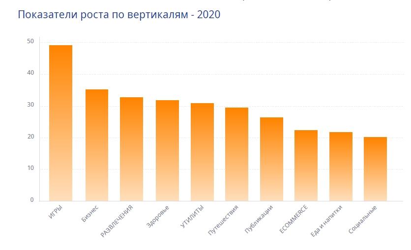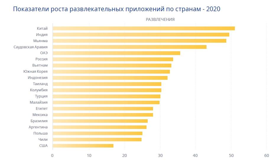 По росту в категории развлекательных приложений Россия заняла шестое место в2020 г.