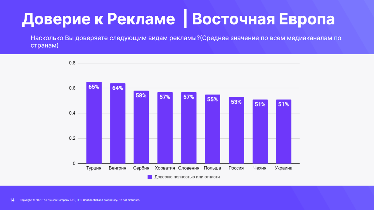 Страны Восточной и Центральной Европы показали самый низкий уровень доверияк рекламе среди всех регионов мира — 57%. Для сравнения: в Африке 80%опрошенных в той или иной степени уверены в надежности рекламы, в ЛатинскойАмерике этот показатель находится на уровне 75%, в Азиатско-Тихоокеанскомрегионе — на уровне 65%. Таковы результатыисследования Global Trust in Advertising, проведенногоNielsen на 56 рынках.