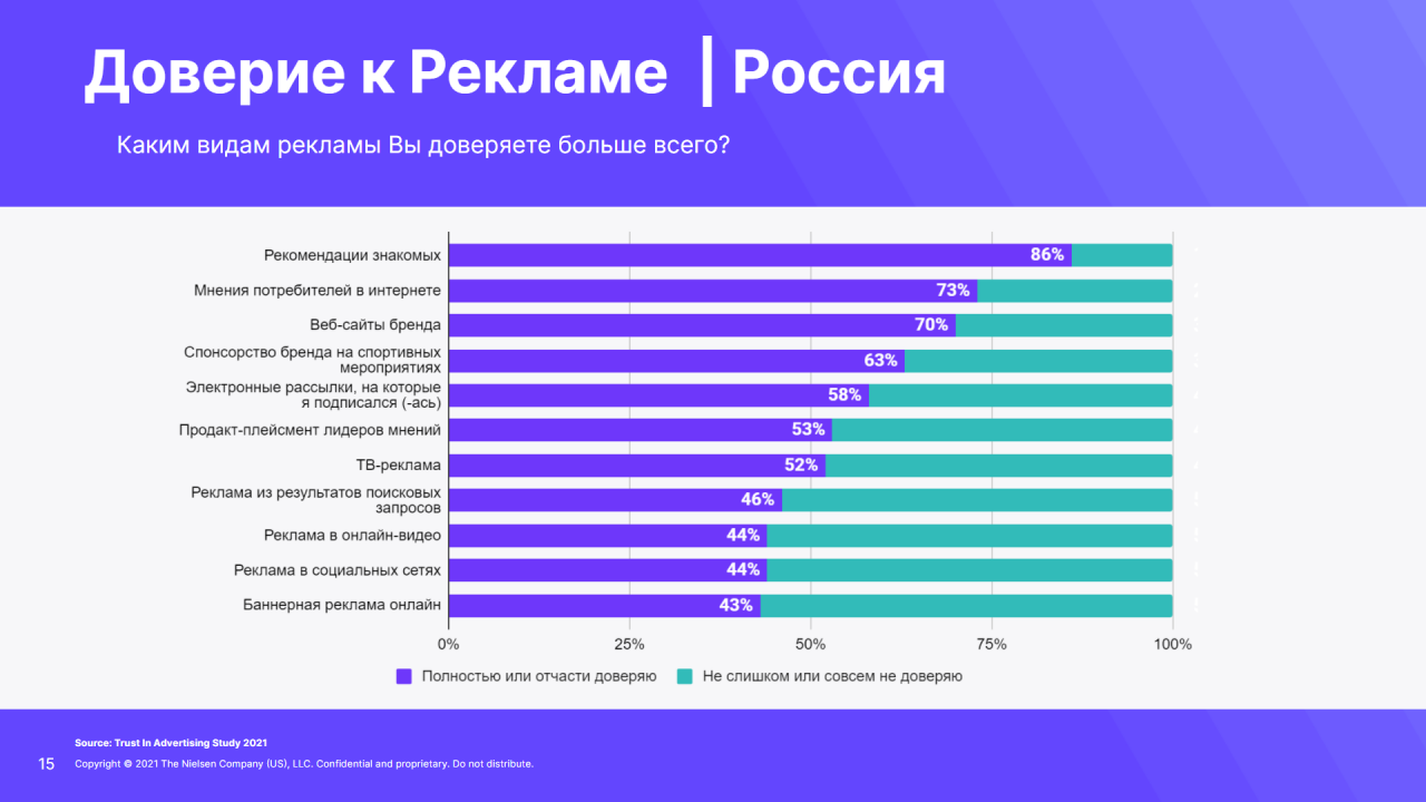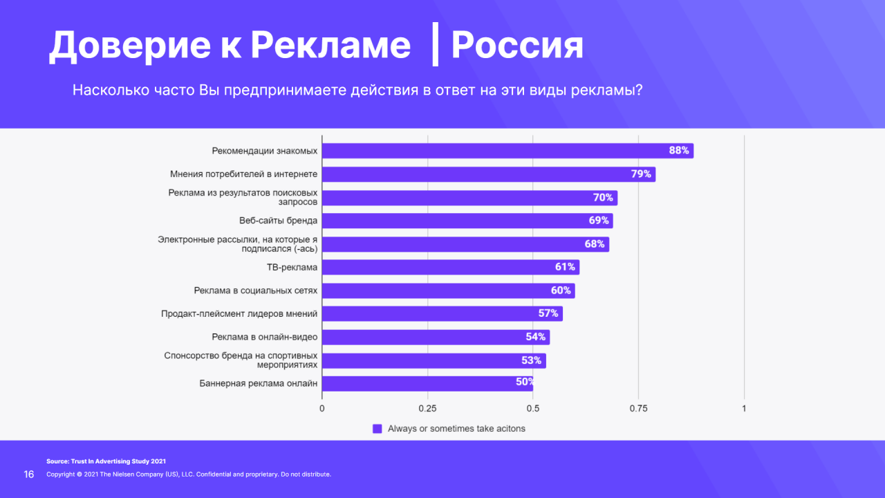 Уровень доверия к рекламным каналам отличается в зависимости от возрастапотребителей. Так, реклама в социальных медиа имеет значительно большее влияниена миллениалов, чем на поколение X и бумеров, а аудитория 65+ доверяет рекламев поиске больше, чем ТВ-рекламе.