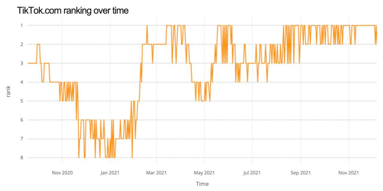 Под конец 2021 г. TikTok.comвозглавил Top Domains Ranking, составленный компаниейCloudflare. Победное шествие TikTok началось в феврале, потом он поднимался напервую позицию в марте и в мае. После 10 августа он уверенно лидировал большуючасть дней, лишь периодически уступая Google. В частности, видеосервис был втопе в День благодарения (25 ноября) в Черную пятницу (26 ноября).