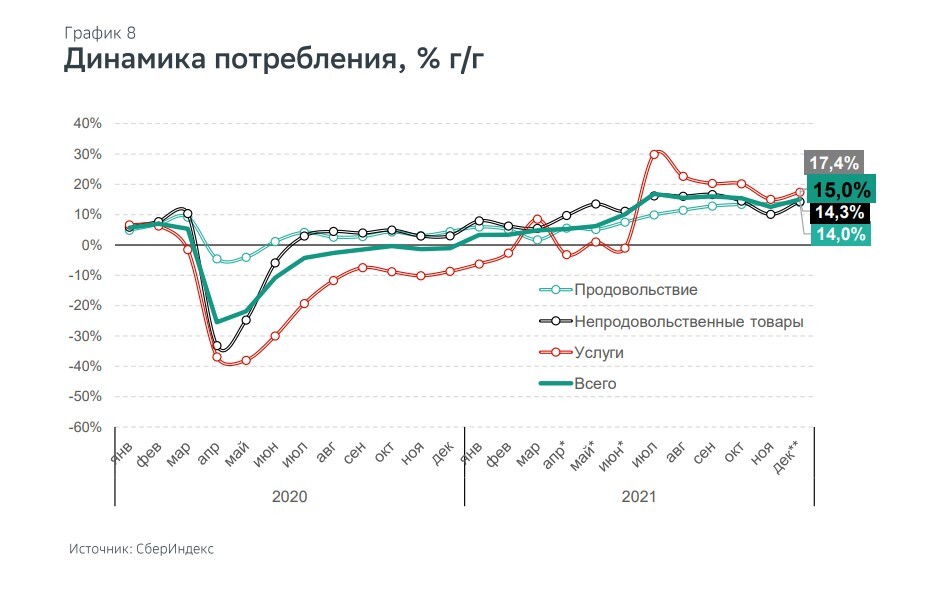 В четвертом квартале этого года доля расходов на услуги составила 23,6% всравнении с 25,4% в конце 2019 г. Разрыв в 1,5–2% сохраняется даже вотносительно благополучный, по мнению экспертов, период, когда россияне могутсвободно посещать рестораны, кинотеатры и спа.