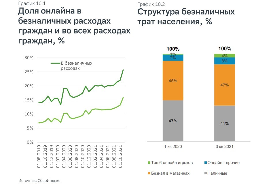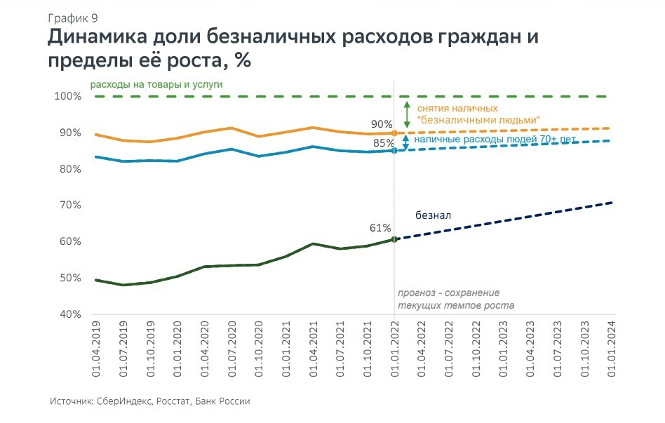 При этом потребители стали чаще пользоваться безналичными платежами — ихдоля за год увеличилась с 56 до 61%. Аналитики ожидают, что этипоказатели продолжат расти и в 2022 г. благодаря развитию онлайн-торговли. Вближайшие годы доля безнала может достичь своего максимума в 85%.