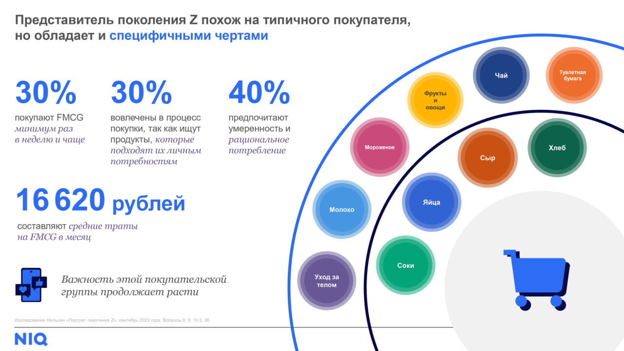 Большинство представителей поколения Z (люди, родившиеся между 1997 и 2012гг.) точно знают, что хотят приобрести в магазине: 7 из 10 опрошенных зумеровпланируют конкретную характеристику товара, например газировку с любимымвкусом. Еще почти 40% приходят в магазин за определенным продуктом. Более 50%респондентов имеют сформированный набор брендов, которые покупают всегда,согласно данным опросаNielsenIQ.