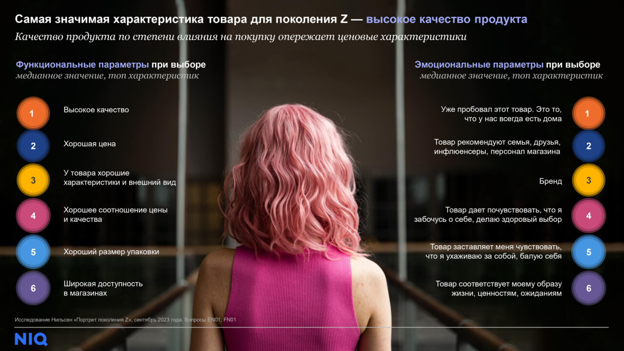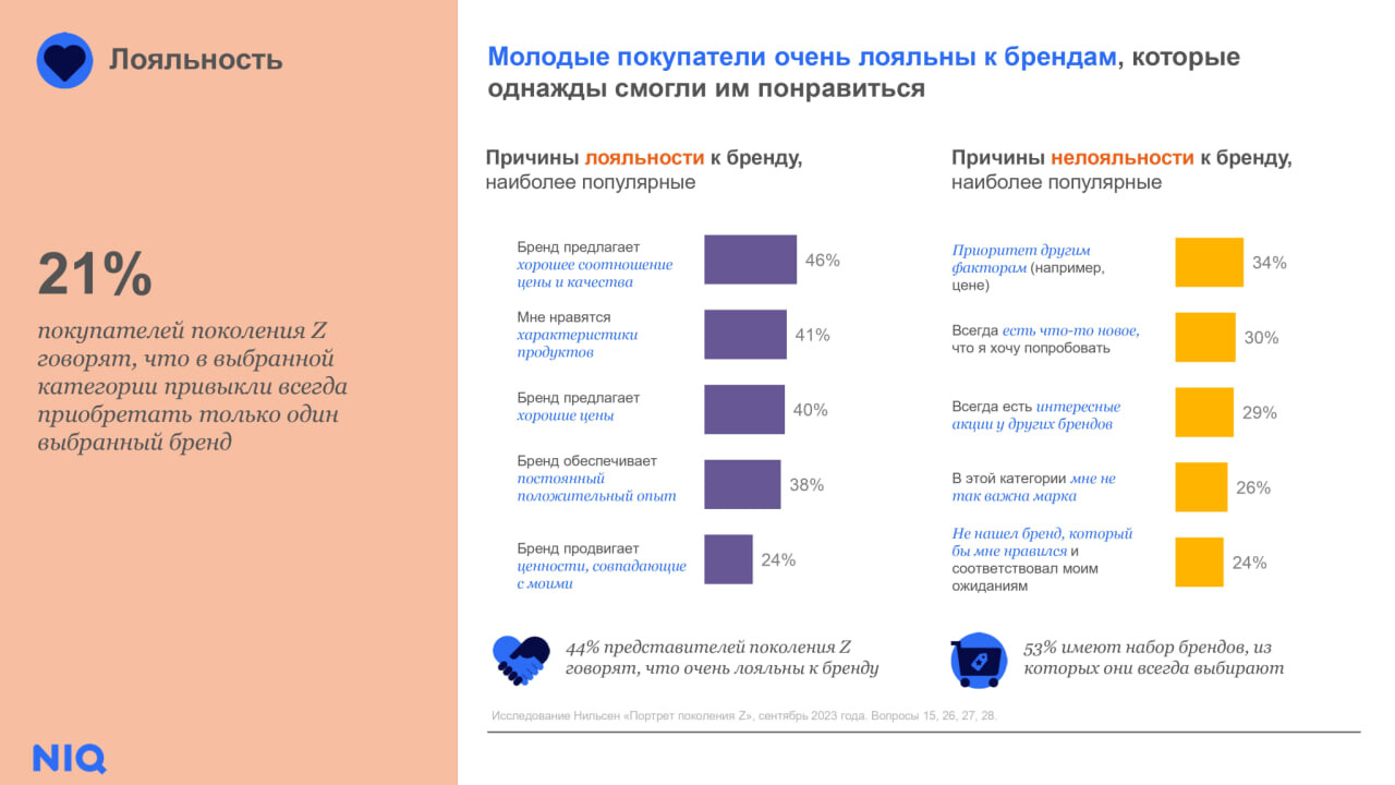 Среди причин, почему отдельные товары больше других привлекают поколение Z,— соотношение цены и качества (46%), постоянный положительный опыт, которым ихобеспечивает бренд (38%), а также разделение ценностей, совпадающих с ихсобственными (24%).