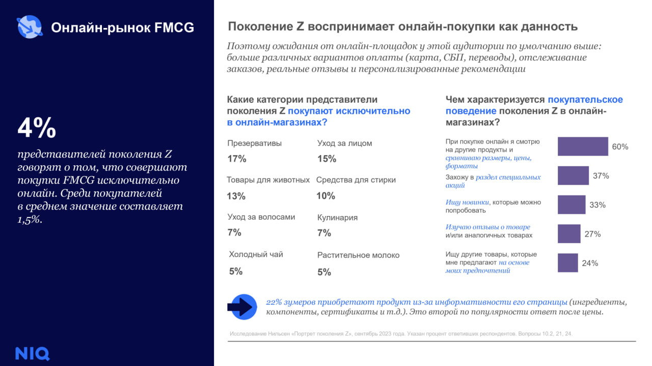Около 4% опрошенных представителей поколения Z сообщили, что покупаютFMCG-категории исключительно в интернете. Это почти втрое выше по сравнению состальными покупателями — 1,5%. Эксперты отмечают, что у этой аудиторииожидания от интернет-магазинов выше. Для зумеров важны такие параметры, какналичие различных вариантов оплаты, отслеживание заказов, реальные отзывы иперсонализированные рекомендации.