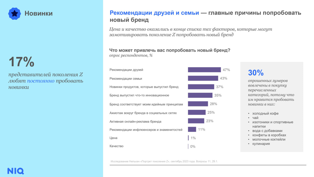Тем не менее 30% респондентов говорят о том, что на рынке появляются новыетовары, которые они хотели бы попробовать, а каждый пятый (17%) постоянноприобретает новинки. При этом ключевой причиной, побуждающей зумеров к покупкеновых продуктов, стал покупательский опыт друзей и семьи — 47 и 43%соответственно.