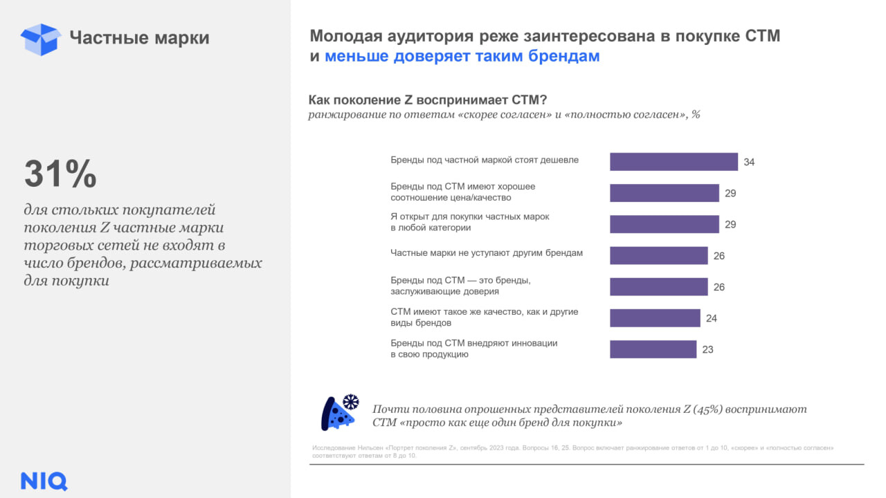 Более 30% молодых покупателей вообще не рассматривают для покупкисобственные торговые марки (СТМ) ретейлеров. Четверть зумеров характеризуют СТМкак товары, заслуживающие доверия (26%), отмечают сопоставимое с брендамипроизводителей качество (24%) и инновации (23%).