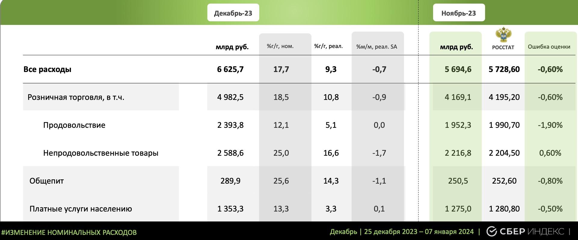 Потребительские расходы россиян составили 6,6 трлн руб. в декабре 2023 г.,что на 17,7% выше в номинальном выражении, чем в декабре 2022 г., и на 9,3% — вреальном, согласно данным «СберИндекса».