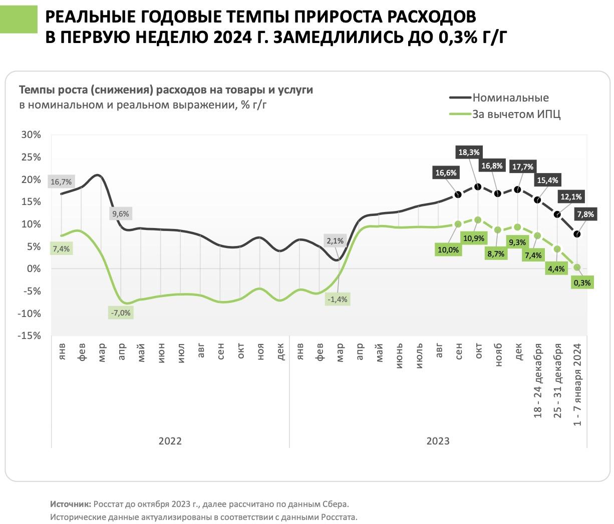 В течение прошлого года потребительский спрос был сильным во всех категорияхрасходов, утверждают эксперты. Потребление продовольственных товаров вернулоськ допандемийным значениям, но уровня 2014 г. не достигло. При этом расходы наобщепит в ноябре и услуги в декабре достигли максимума с 2012 г. На фонеускорения инфляции и ожиданий по повышению ключевой ставки потреблениенепродовольственных товаров вышло на пик в октябре 2023 г. Потребление всегменте за этот месяц стало третьим по величине за всю историю наблюденийпосле декабря 2014 г. и февраля 2022 г.