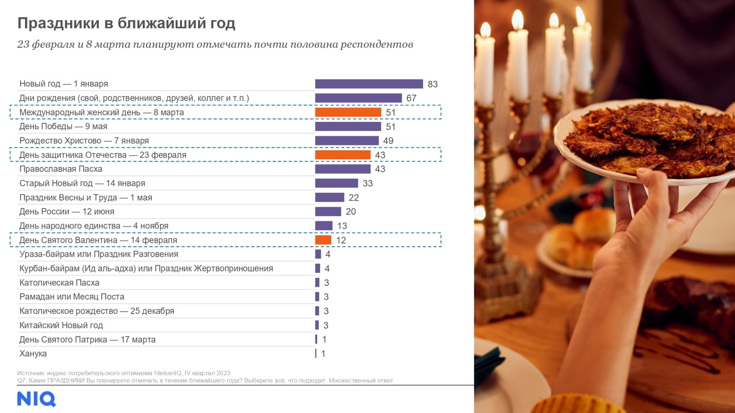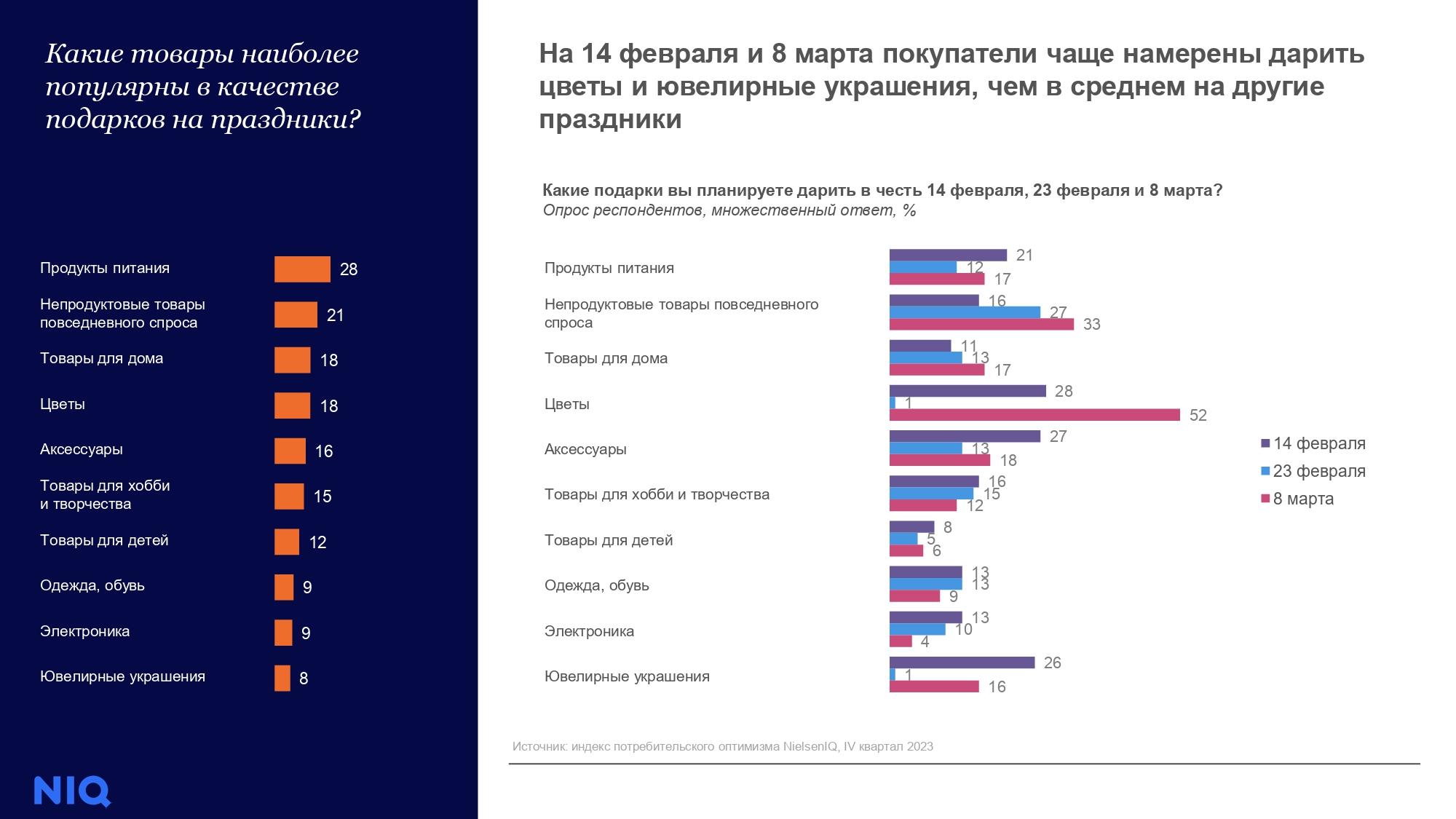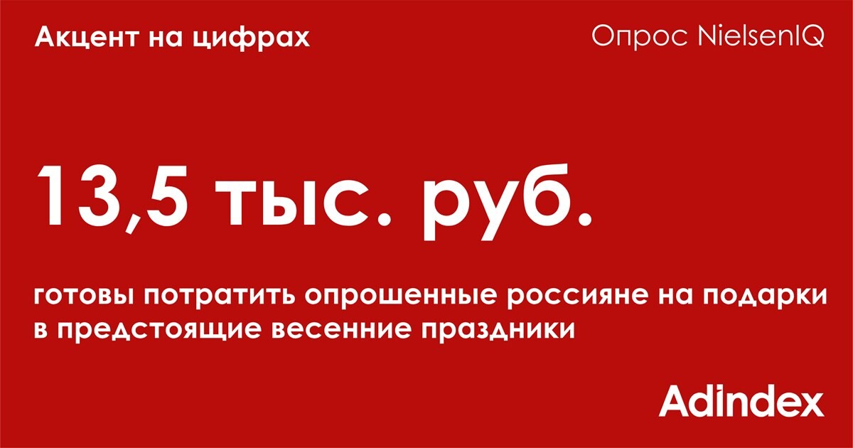 Опрошенные россияне готовы потратить на подарки в предстоящие весенниепраздники (День святого Валентина, 23 Февраля, 8 Марта) в среднем более 13,5тыс. руб. Из них примерно 4 тыс. руб. приходится на День святого Валентина,около 3,5 тыс. руб. — на 23 Февраля и 6 тыс. руб.— на 8 Марта, согласноданным опроса NielsenIQ.