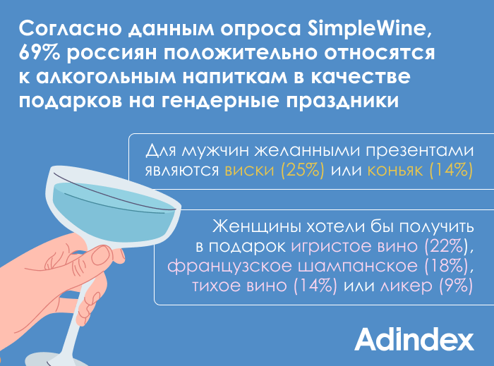 Согласно данным опроса SimpleWine, 69% россиян положительно относятся калкогольным напиткам в качестве подарков на гендерные праздники. Для мужчинжеланными презентами являются виски — 25% или коньяк — 14%. Женщины хотели быполучить в подарок игристое вино — 22%, французское шампанское — 18%, тихоевино — 14% или ликер — 9%.