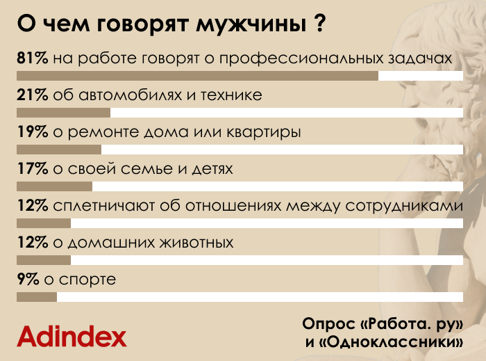 Более 80% опрошенных мужчин на работе говорят о профессиональных задачах,согласно опросу «Работы.ру» и соцсети «Одноклассники». Следом за рабочимивопросами идут личные интересы: 21% респондентов предпочитают обсуждатьавтомобили и технику, 19% — ремонт дома или квартиры, 17% много говорят о своейсемье и детях, а 12% сплетничают об отношениях между сотрудниками. Домашнихживотных и спорт любят обсудить 12 и 9% мужчин соответственно.