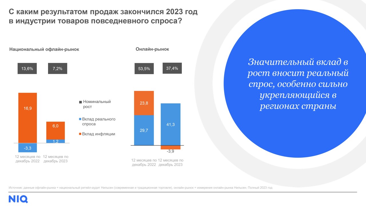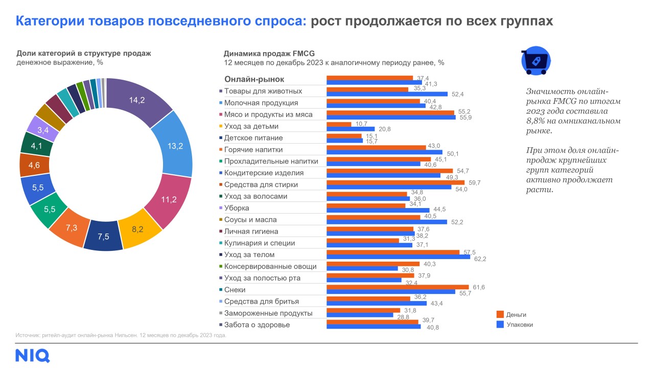 «Благодаря этим факторам интернет-торговля обеспечила пятую часть отроста всего омниканального рынка (суммарные продажи товаров повседневногоспроса в каналах современной торговли и в интернет-магазинах имаркетплейсах)», — сообщили в NielsenIQ.